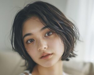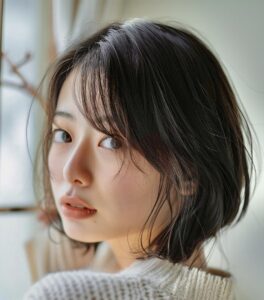 前髪をせまめにし、斜めする事でフェイスラインとお顔の輪郭が馴染む事により